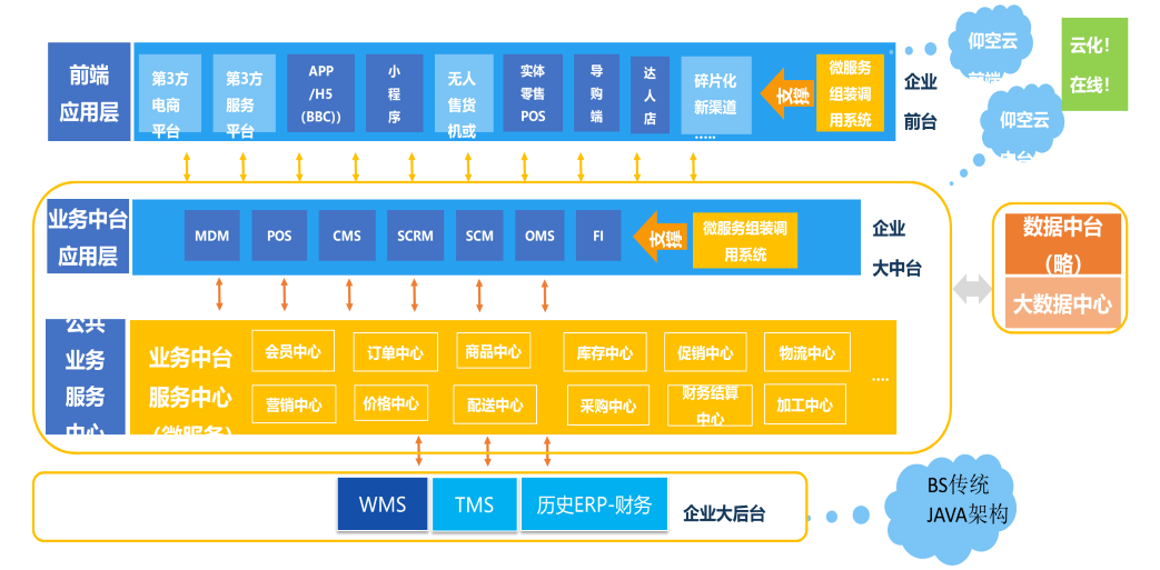 从2017年1月份开始,酷乐潮玩花了一年多时间接触了许多著名的IT信息系统供应商,但没有发现一套比较成熟的云计算微服化全渠道新零售端到端IT系统解决方案。就在酷乐潮玩新零售战略受阻一筹莫展之际,2018年4月份偶遇激荡公司,双方团队一见如故。在星动力董事长和CIO的亲自参与下,经过对激荡公司及其中台系统历时5个多月的评估认证后,今年9月中旬双方正式完成了合同签署。在项目启动会上,星动力董事长和CIO满怀信心地表示:激荡公司新零售全渠道云中台系统至少领先其他竞争对手2-3年以上,采用激荡的新零售全渠道云中台系统将确保星动力新零售业务发展在杂货行业始终处于领先地位。酷乐潮玩方案如下